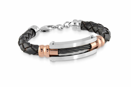 Italgem Stainless Steel Black Cable Leather Bracelet